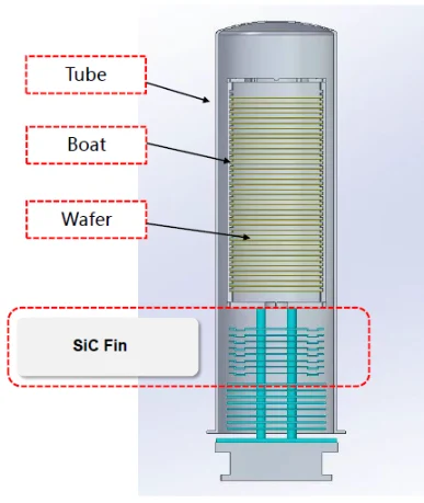 Semicorex bərksilisium karbid qanadlarıadətən RTP yuyucu sobalar və diffuziya sobaları kimi yarımkeçirici istilik müalicəsi avadanlığının şaquli soba borularının içərisində istilik izolyasiya komponentləri kimi quraşdırılır. Semicorex bərk silisium karbid qanadları yüksək temperaturlu sobalarda temperatur paylanmasını effektiv şəkildə tənzimləyə və yüksək temperaturun səbəb olduğu emal qapılarının möhürləyici hissələrinə istilik zərərini minimuma endirə bilər. Yaş oksidləşmə iş şəraitində Semicorex bərk silisium karbid qanadları nisbətən aşağı proses temperaturlarında su buxarının kondensasiyası nəticəsində proses nəticələrinə və yarımkeçirici cihazlara mənfi təsirlərin qarşısını effektiv şəkildə almaq üçün istifadə edilə bilər.
